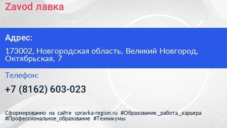 Zavod лавка по адресу 173002, Новгородская область, Великий Новгород, Октябрьская, 7 в дальнейшем Организация, размещена в следующих категориях: