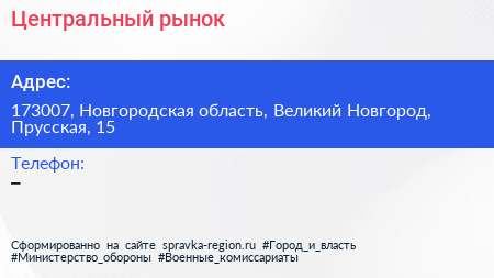 Центральный рынок по адресу 173007, Новгородская область, Великий Новгород, Прусская, 15 в дальнейшем Организация, размещена в следующих категориях: