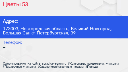 Цветы 53 по адресу 173003, Новгородская область, Великий Новгород, Большая Санкт-Петербургская, 39 в дальнейшем Организация, размещена в следующих категориях: