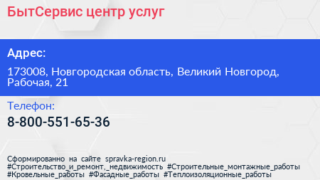 БытСервис, центр услуг по адресу 173008, Новгородская область, Великий Новгород, Рабочая, 21 в дальнейшем Организация, размещена в следующих категориях: