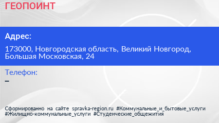ГЕОПОИНТ по адресу 173000, Новгородская область, Великий Новгород, Большая Московская, 24 в дальнейшем Организация, размещена в следующих категориях: