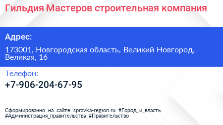 Гильдия Мастеров, строительная компания по адресу 173001, Новгородская область, Великий Новгород, Великая, 16 в дальнейшем Организация, размещена в следующих категориях: