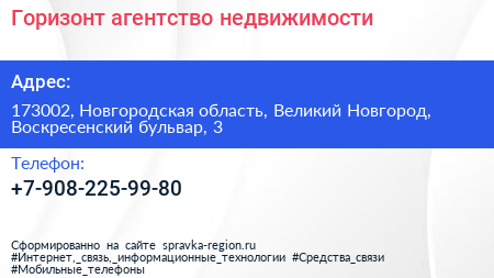 Горизонт, агентство недвижимости по адресу 173002, Новгородская область, Великий Новгород, Воскресенский бульвар, 3 в дальнейшем Организация, размещена в следующих категориях: