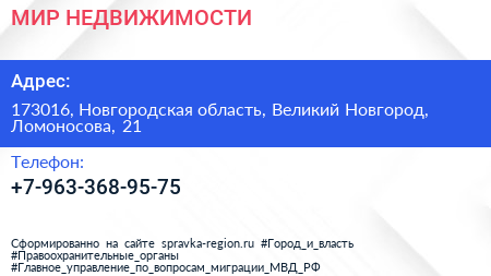 МИР НЕДВИЖИМОСТИ по адресу 173016, Новгородская область, Великий Новгород, Ломоносова, 21 в дальнейшем Организация, размещена в следующих категориях: