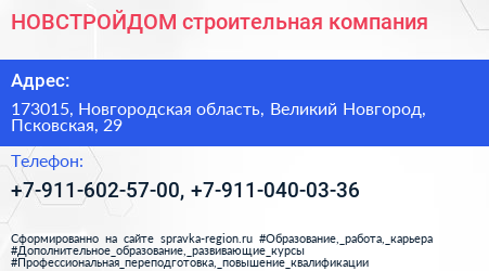 НОВСТРОЙДОМ, строительная компания по адресу 173015, Новгородская область, Великий Новгород, Псковская, 29 в дальнейшем Организация, размещена в следующих категориях: