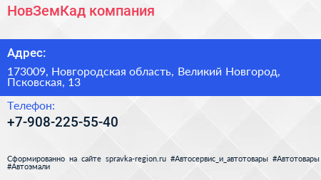 НовЗемКад, компания по адресу 173009, Новгородская область, Великий Новгород, Псковская, 13 в дальнейшем Организация, размещена в следующих категориях: