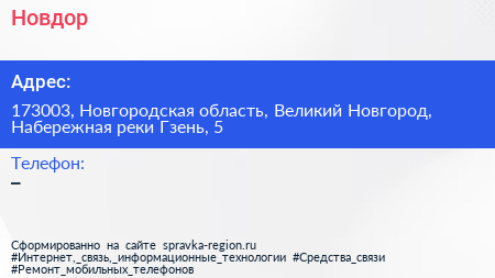 Новдор по адресу 173003, Новгородская область, Великий Новгород, Набережная реки Гзень, 5 в дальнейшем Организация, размещена в следующих категориях: