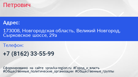 Петрович по адресу 173008, Новгородская область, Великий Новгород, Сырковское шоссе, 29а в дальнейшем Организация, размещена в следующих категориях: