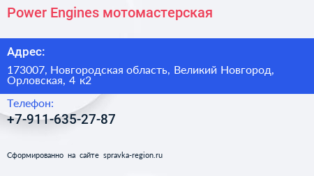 Power Engines, мотомастерская по адресу 173007, Новгородская область, Великий Новгород, Орловская, 4 к2 в дальнейшем Организация, размещена в следующих категориях: