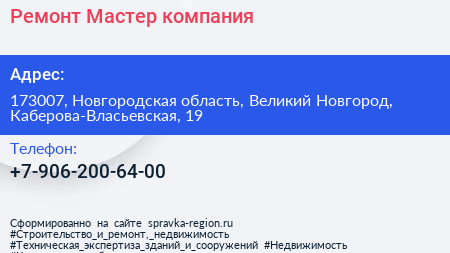 Ремонт-Мастер, компания по адресу 173007, Новгородская область, Великий Новгород, Каберова-Власьевская, 19 в дальнейшем Организация, размещена в следующих категориях: