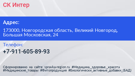 СК Интер по адресу 173000, Новгородская область, Великий Новгород, Большая Московская, 24 в дальнейшем Организация, размещена в следующих категориях: