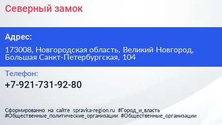 Северный замок по адресу 173008, Новгородская область, Великий Новгород, Большая Санкт-Петербургская, 104 в дальнейшем Организация, размещена в следующих категориях: