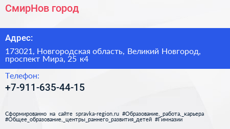 СмирНов-город по адресу 173021, Новгородская область, Великий Новгород, проспект Мира, 25 к4 в дальнейшем Организация, размещена в следующих категориях: