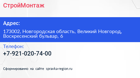 СтройМонтаж по адресу 173002, Новгородская область, Великий Новгород, Воскресенский бульвар, 6 в дальнейшем Организация, размещена в следующих категориях: