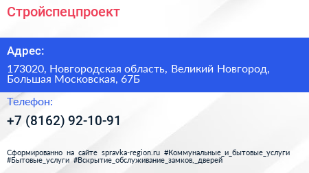 Стройспецпроект по адресу 173020, Новгородская область, Великий Новгород, Большая Московская, 67Б в дальнейшем Организация, размещена в следующих категориях: