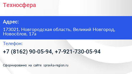 Техносфера по адресу 173021, Новгородская область, Великий Новгород, Новосёлов, 17а в дальнейшем Организация, размещена в следующих категориях: