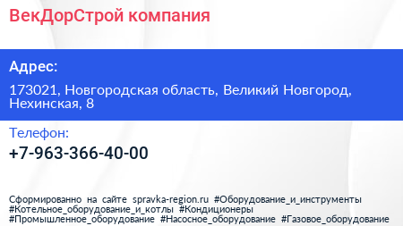 ВекДорСтрой, компания по адресу 173021, Новгородская область, Великий Новгород, Нехинская, 8 в дальнейшем Организация, размещена в следующих категориях: