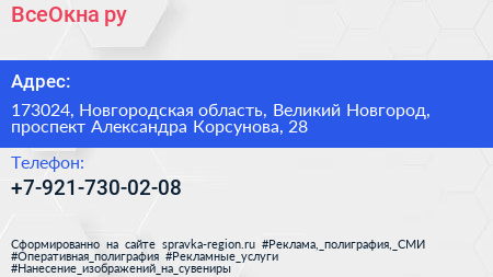 ВсеОкна.ру по адресу 173024, Новгородская область, Великий Новгород, проспект Александра Корсунова, 28 в дальнейшем Организация, размещена в следующих категориях:
