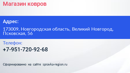 Магазин ковров по адресу 173009, Новгородская область, Великий Новгород, Псковская, 56 в дальнейшем Организация, размещена в следующих категориях: