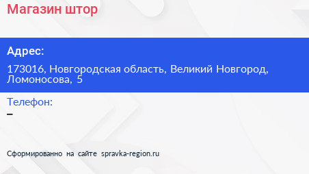 Магазин штор по адресу 173016, Новгородская область, Великий Новгород, Ломоносова, 5 в дальнейшем Организация, размещена в следующих категориях: