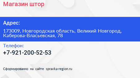 Магазин штор по адресу 173009, Новгородская область, Великий Новгород, Каберова-Власьевская, 78 в дальнейшем Организация, размещена в следующих категориях: