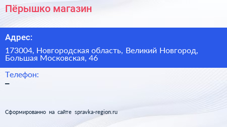 Пёрышко, магазин по адресу 173004, Новгородская область, Великий Новгород, Большая Московская, 46 в дальнейшем Организация, размещена в следующих категориях: