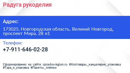 Радуга рукоделия по адресу 173025, Новгородская область, Великий Новгород, проспект Мира, 28 к1 в дальнейшем Организация, размещена в следующих категориях: