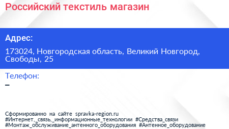 Российский текстиль, магазин по адресу 173024, Новгородская область, Великий Новгород, Свободы, 25 в дальнейшем Организация, размещена в следующих категориях: