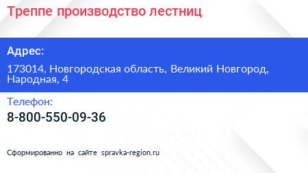 Треппе, производство лестниц по адресу 173014, Новгородская область, Великий Новгород, Народная, 4 в дальнейшем Организация, размещена в следующих категориях: