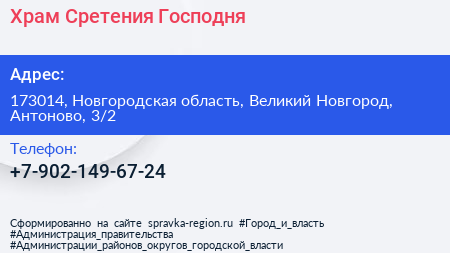 Храм Сретения Господня по адресу 173014, Новгородская область, Великий Новгород, Антоново, 3/2 в дальнейшем Организация, размещена в следующих категориях: