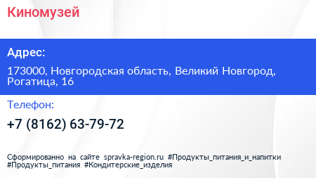 Киномузей по адресу 173000, Новгородская область, Великий Новгород, Рогатица, 16 в дальнейшем Организация, размещена в следующих категориях: