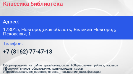 Классика, библиотека по адресу 173015, Новгородская область, Великий Новгород, Псковская, 1 в дальнейшем Организация, размещена в следующих категориях: