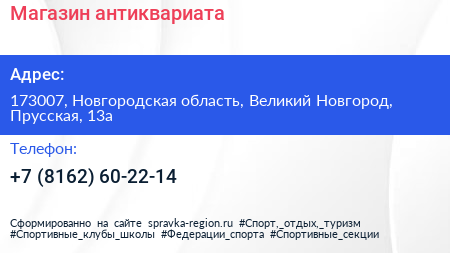 Магазин антиквариата по адресу 173007, Новгородская область, Великий Новгород, Прусская, 13а в дальнейшем Организация, размещена в следующих категориях: