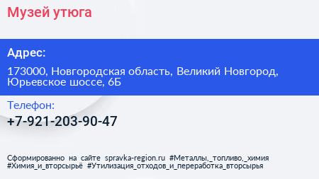 Музей утюга по адресу 173000, Новгородская область, Великий Новгород, Юрьевское шоссе, 6Б в дальнейшем Организация, размещена в следующих категориях: