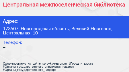 Центральная межпоселенческая библиотека по адресу 173507, Новгородская область, Великий Новгород, Центральная, 10 в дальнейшем Организация, размещена в следующих категориях: