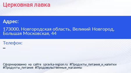 Церковная лавка по адресу 173000, Новгородская область, Великий Новгород, Большая Московская, 44 в дальнейшем Организация, размещена в следующих категориях: