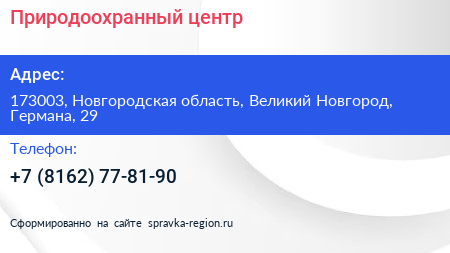 Природоохранный центр по адресу 173003, Новгородская область, Великий Новгород, Германа, 29 в дальнейшем Организация, размещена в следующих категориях: