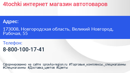 4tochki, интернет-магазин автотоваров по адресу 173008, Новгородская область, Великий Новгород, Рабочая, 55 в дальнейшем Организация, размещена в следующих категориях:
