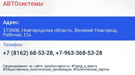 АВТОсистемы по адресу 173008, Новгородская область, Великий Новгород, Рабочая, 11а в дальнейшем Организация, размещена в следующих категориях: