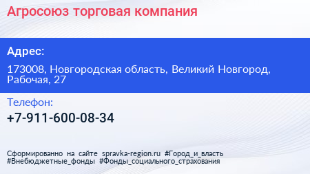 Агросоюз, торговая компания по адресу 173008, Новгородская область, Великий Новгород, Рабочая, 27 в дальнейшем Организация, размещена в следующих категориях: