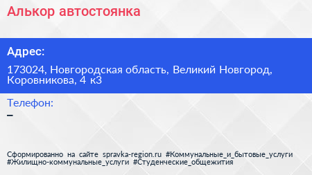 Алькор, автостоянка по адресу 173024, Новгородская область, Великий Новгород, Коровникова, 4 к3 в дальнейшем Организация, размещена в следующих категориях: