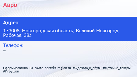 Авро по адресу 173008, Новгородская область, Великий Новгород, Рабочая, 38а в дальнейшем Организация, размещена в следующих категориях: