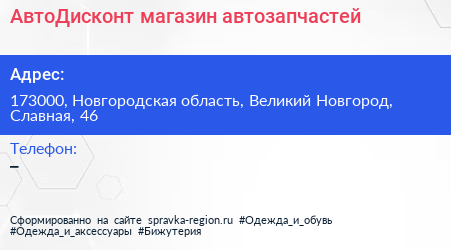АвтоДисконт, магазин автозапчастей по адресу 173000, Новгородская область, Великий Новгород, Славная, 46 в дальнейшем Организация, размещена в следующих категориях: