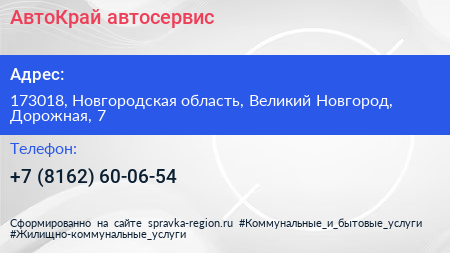 АвтоКрай, автосервис по адресу 173018, Новгородская область, Великий Новгород, Дорожная, 7 в дальнейшем Организация, размещена в следующих категориях: