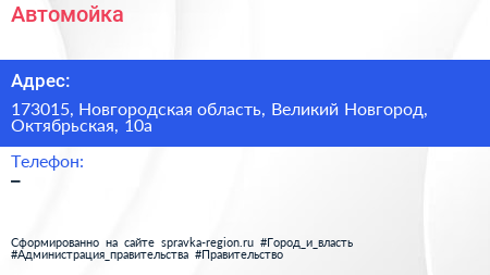 Автомойка по адресу 173015, Новгородская область, Великий Новгород, Октябрьская, 10а в дальнейшем Организация, размещена в следующих категориях: