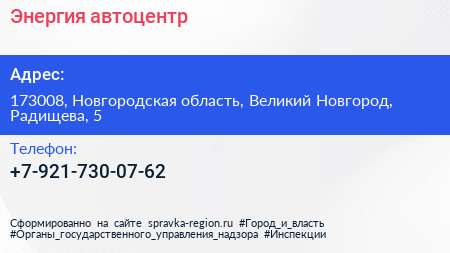 Энергия, автоцентр по адресу 173008, Новгородская область, Великий Новгород, Радищева, 5 в дальнейшем Организация, размещена в следующих категориях: