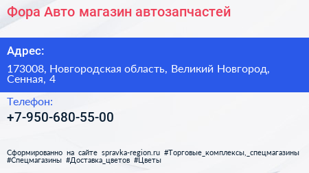 Фора-Авто, магазин автозапчастей по адресу 173008, Новгородская область, Великий Новгород, Сенная, 4 в дальнейшем Организация, размещена в следующих категориях: