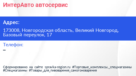 ИнтерАвто, автосервис по адресу 173008, Новгородская область, Великий Новгород, Базовый переулок, 17 в дальнейшем Организация, размещена в следующих категориях: