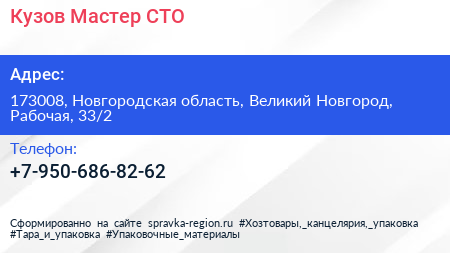 Кузов Мастер, СТО по адресу 173008, Новгородская область, Великий Новгород, Рабочая, 33/2 в дальнейшем Организация, размещена в следующих категориях: