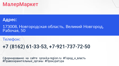 МалерМаркет по адресу 173008, Новгородская область, Великий Новгород, Рабочая, 50 в дальнейшем Организация, размещена в следующих категориях: